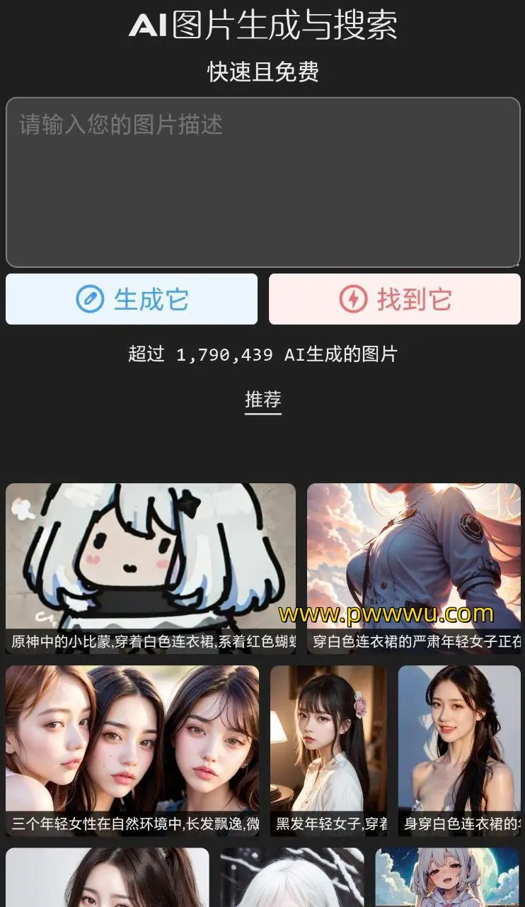 AI绘图是一个高效的AI图像生成与搜索工具,为用户提供了一个免费的平台。在这个平台上,用户能够生成或搜索到超过178万张由AI创作的图像。该网站展示了丰富的图像样本,如风景画作、动漫角色以及超现实的幻境,这些图像不仅种类繁多,还跨越了传统至现代的多样艺术风格。