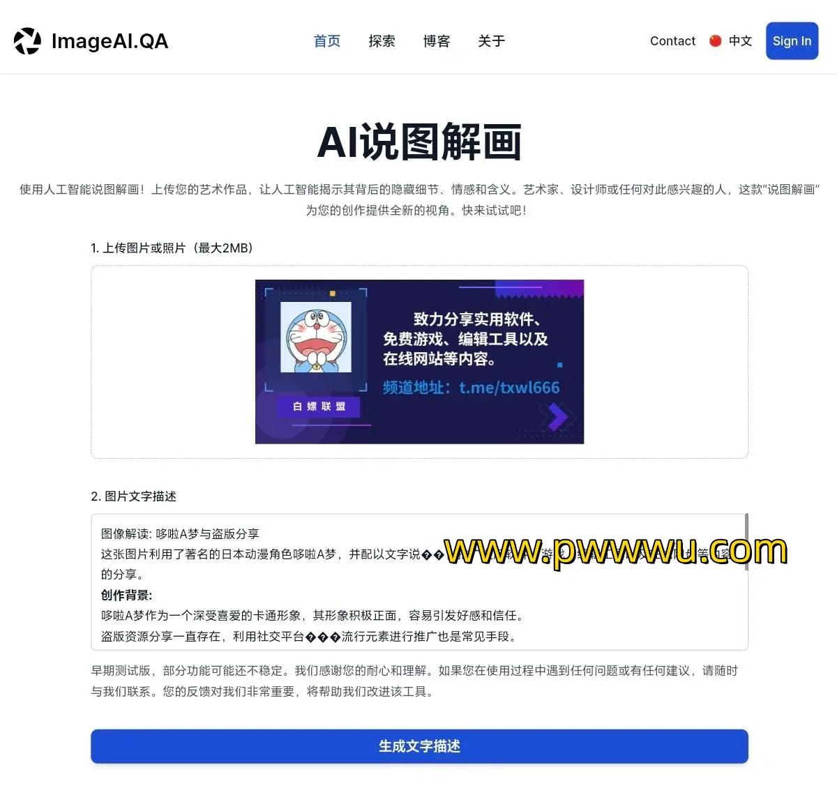使用人工智能技术解读艺术作品,揭秘隐藏在创作背后的细节、情感和深意。我们邀请艺术家、设计师以及所有热爱艺术的人士,体验这款“说图解画”服务,为您的艺术创作带来全新的视角。即刻上传您的作品,开启一段探索之旅。