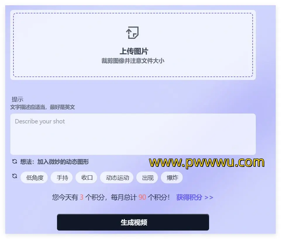 我们的免费计划为您提供了90学分,每天可生成3个视频,让您轻松起步,尽情发挥创意。通过这款AI生成器,您可以轻松实现从静态到动态的转变,让每一帧图片都充满生命力。无论是为社交媒体制作趣味内容,还是为企业营销打造吸引人的展示视频,或是为产品介绍制作生动的介绍片,我们的AI生成器都能助您一臂之力。