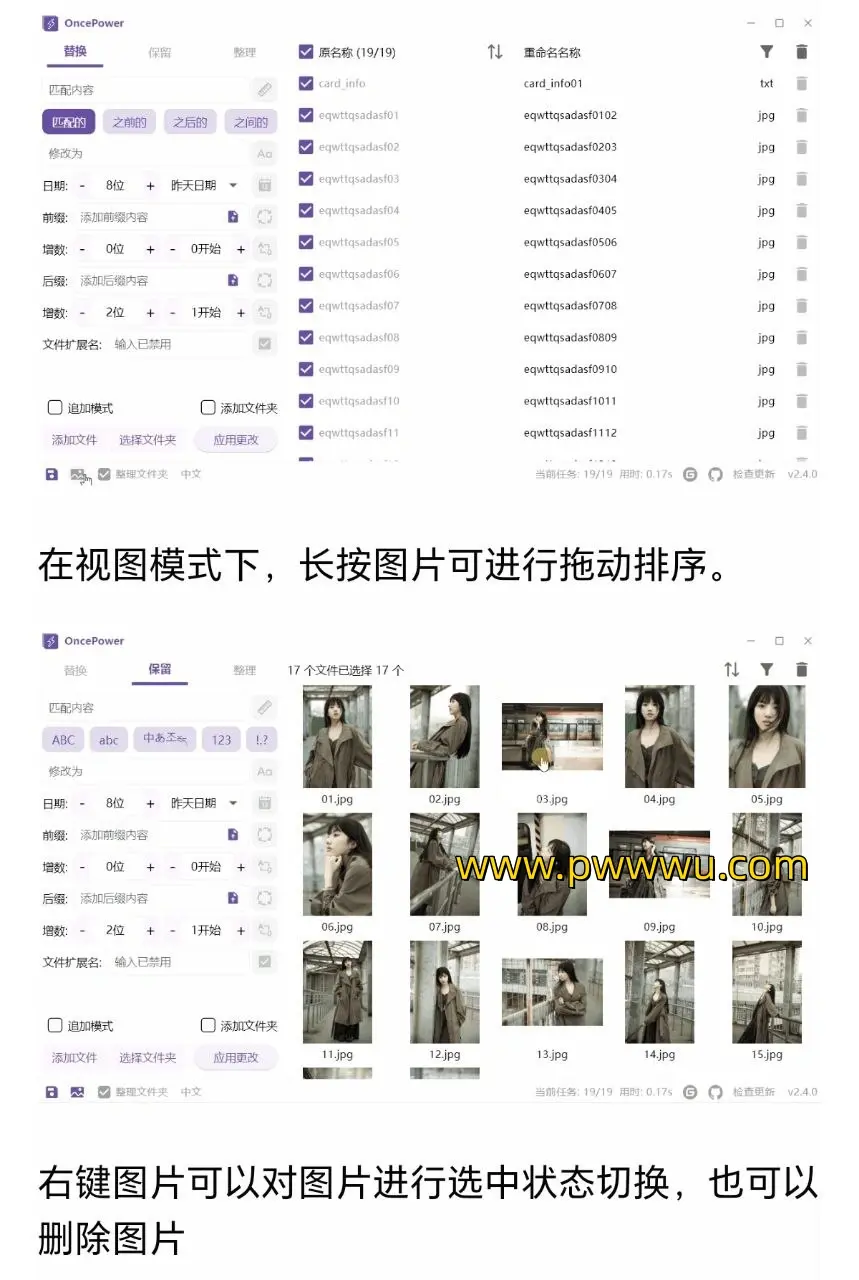 在图片处理方面,OncePower的视图模式功能为用户提供了一种全新的图片重命名体验。用户可以在视图模式下直观地预览图片,并根据需要进行快速重命名,这不仅提高了操作的便捷性,也使得图片管理变得更加高效。
