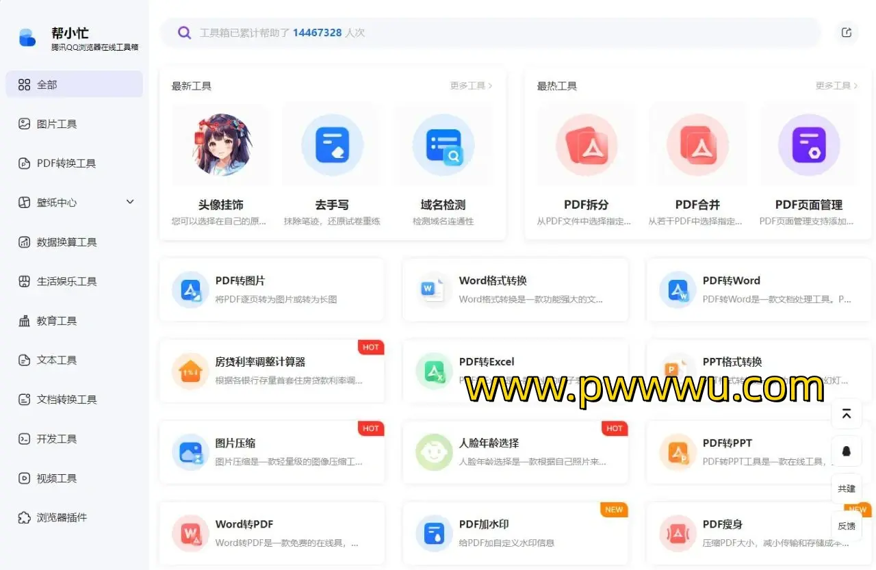 腾讯帮小忙是一个腾讯推出的在线工具平台,它免费为用户提供各类便捷的小工具,无需登录即可使用。目前,这个平台已经集成了超过100种实用的功能工具,覆盖了图片处理、数据换算、生活娱乐、教育、文本处理、文档转换、开发辅助、视频处理和PDF转换等九大领域。