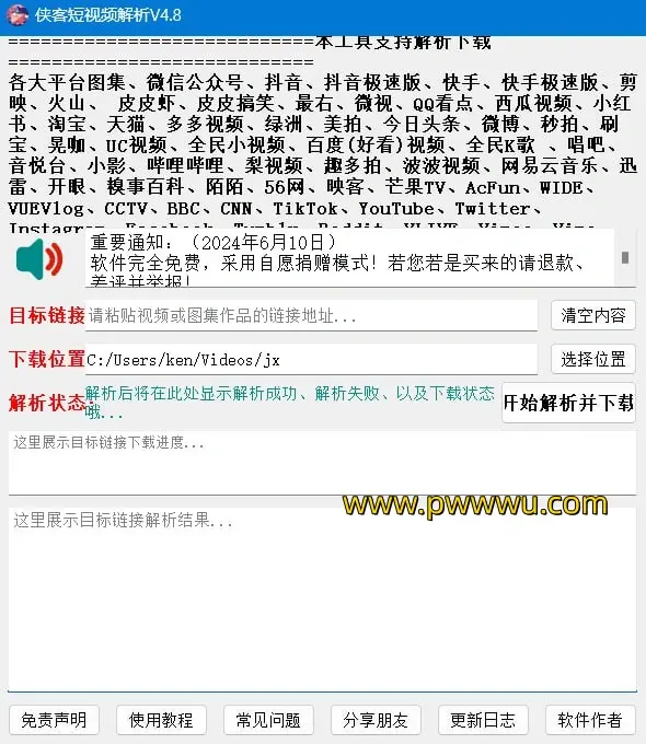 侠客短视频解析工具是一款功能强大的视频处理软件,它能够为用户提供无水印的视频下载服务。这款工具支持从多个流行的短视频平台下载内容,包括抖音、快手、剪映、火山、皮皮虾、皮皮搞笑、最右、微视、QQ看点、西瓜视频、小红书、淘宝、天猫、绿洲、美拍、今日头条、微博等。它还支持从国外平台以及微信公众号获取视频内容。