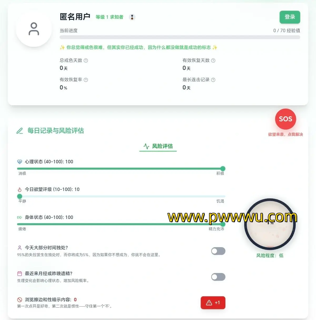 用户可以利用每日评估和记录功能,持续跟踪自己的康复进展。这一功能不仅帮助用户深入了解自己的康复状态,还能识别和管理工作中可能触发色情成瘾的因素,以及潜在的风险。通过这些工具,用户能够更清晰地认识到自己的问题,并逐步实现康复目标。