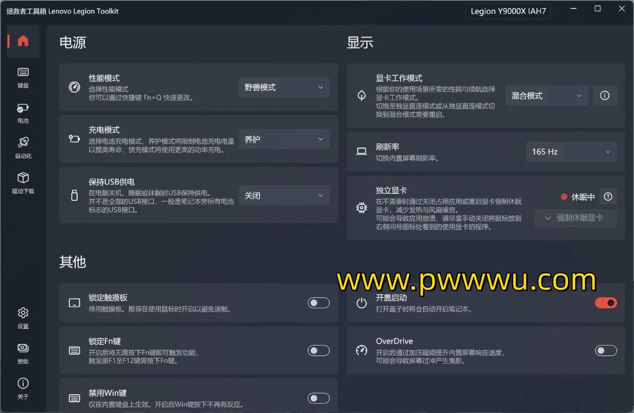 Lenovo Legion Toolkit 为用户提供了便捷的性能调节选项,使其能够根据自己的需求优化笔记本的性能表现。无论是在电源管理、显卡设置还是系统冷却方面,该工具都能提供直观的操作界面,让用户轻松实现性能的自定义调整。它的键盘灯效调节功能也为用户提供了个性化的视觉体验。