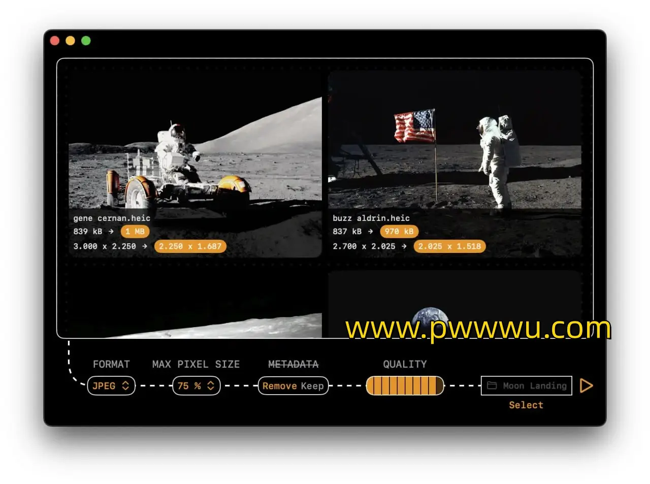 软件界面设计精致,操作直观,同时提供声音效果和触觉反馈功能,增强用户体验。在图片处理过程中,Kompressor允许用户自由选择是否保留EXIF信息,以保护个人隐私。Kompressor完全在本地运行,不涉及任何网络追踪或数据分析,确保用户信息安全。