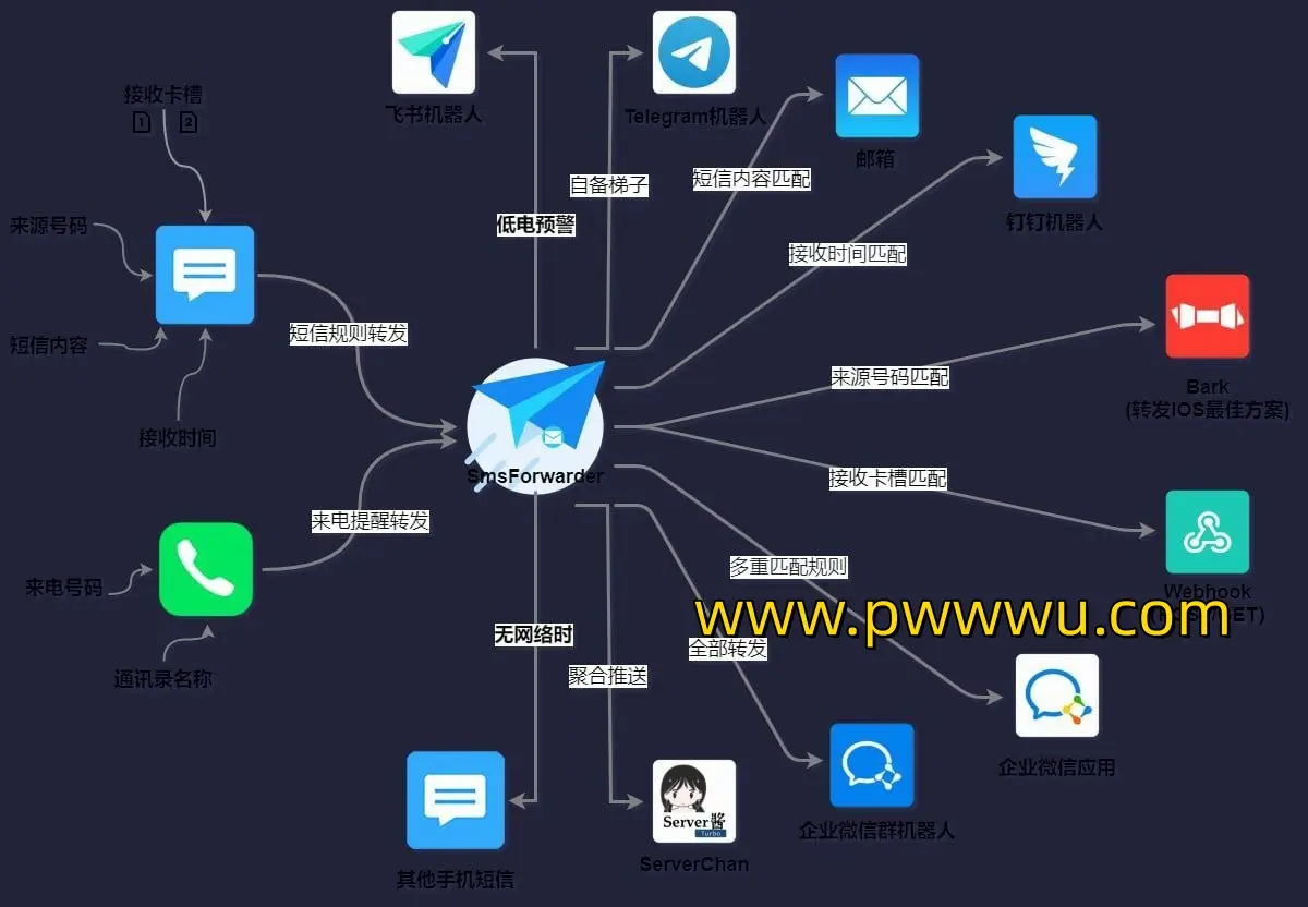 短信转发工具SMS Forwarder,它的体积仅为约5MB,是一款轻量级的应用程序。它能够实时监测您的手机短信,并根据您设定的规则,将短信内容自动转发至不同的服务平台。这款工具支持多种转发渠道,包括但不限于钉钉机器人、企业微信群机器人、飞书机器人、企业微信应用消息、电子邮件、Bark、WebHook、Telegram机器人以及Server酱(Turbo版)。它还支持传统的手机短信转发。