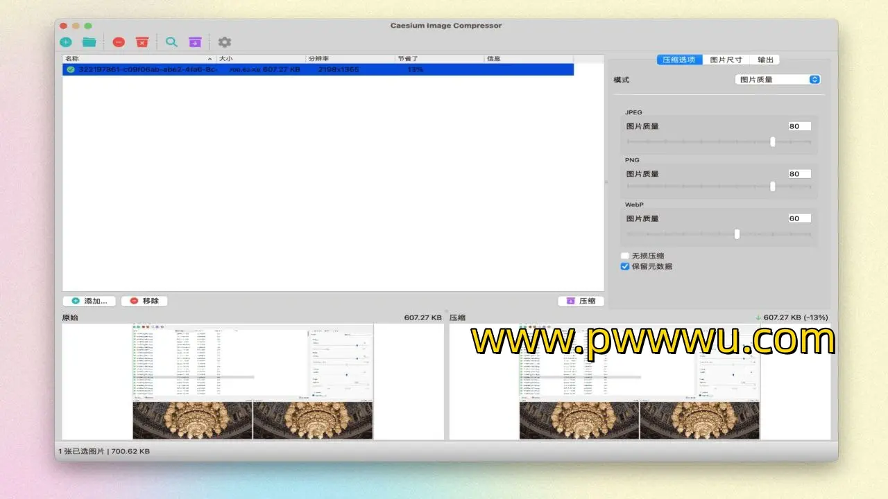 Caesium-image-compressor 是一款功能全面的免费图片压缩软件,采用 C++ 语言编写。它以其简洁的中文界面和对 JPG、PNG 以及 WebP 格式图片的无损压缩能力而受到用户青睐。这款工具不仅支持实时预览和批量处理,还特别考虑到用户的便利性,提供了 Windows、Linux 和 macOS 系统的客户端,以及一个无需安装即可使用的 Web 版本。