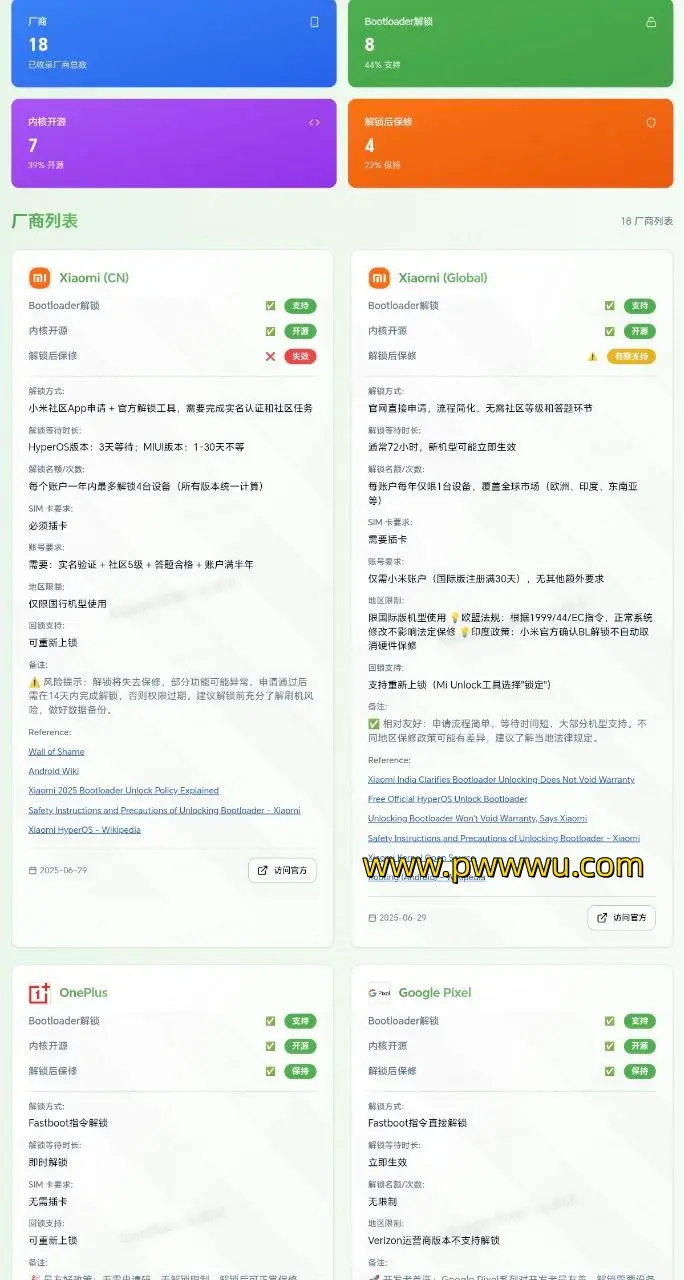 android-locker项目是一个由社区成员共同维护的平台,它汇集了各大安卓厂商的Bootloader解锁状态、内核开源情况和保修政策。这个项目支持中文、英文和印地语等多种语言,界面设计简洁,提供的数据准确而全面。开发者和爱好者可以便捷地查询设备是否支持刷机,解锁Bootloader是否会对保修造成影响,以及解锁可能带来的风险。通过这些信息,用户可以在对设备进行修改之前做出更加明智的选择。