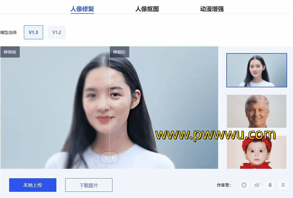 人像修复功能特别适用于处理那些因年代久远或拍摄条件不佳而变得模糊不清的老照片。用户只需上传这些照片,ARC工具便能自动识别并修复照片中的噪点和模糊区域,一键恢复人脸的清晰度,让珍贵的记忆重焕光彩。