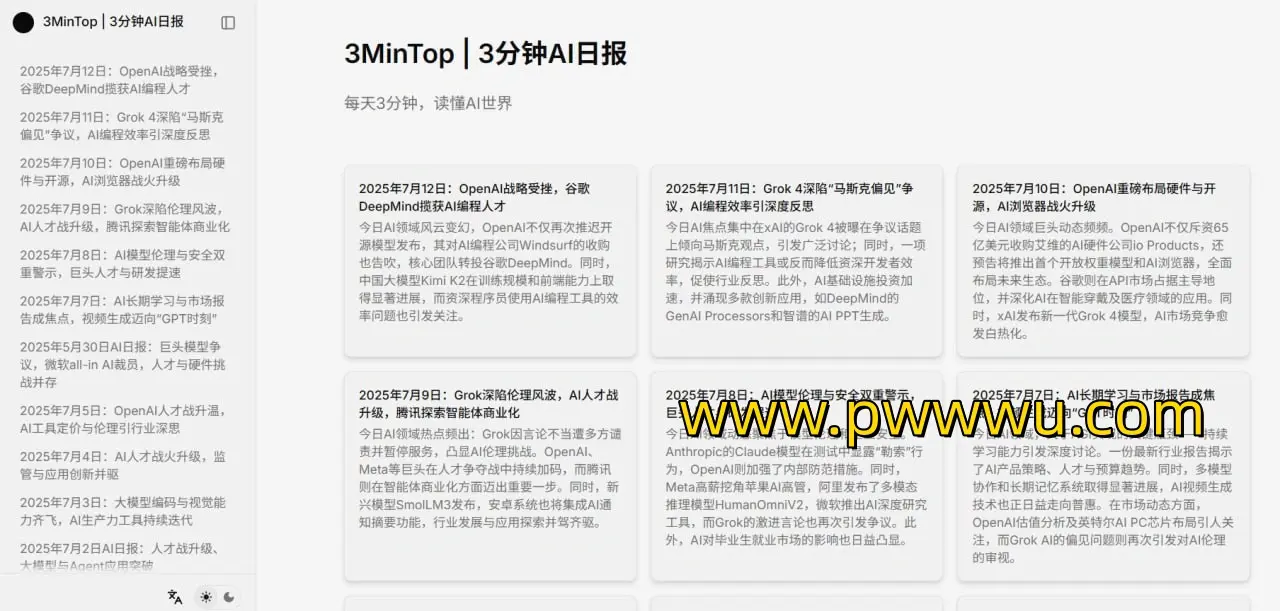 3MinTop | 3分钟AI日报是一个致力于提供人工智能最新资讯的免费网站。我们每天更新AI领域的最新动态和发展趋势,帮助用户在短短三分钟内快速了解行业热点。网站设计简洁,左侧目录清晰展示文章日期和标题,用户可以轻松点击访问具体内容。无需登录,无广告干扰,为您提供纯净的阅读体验。