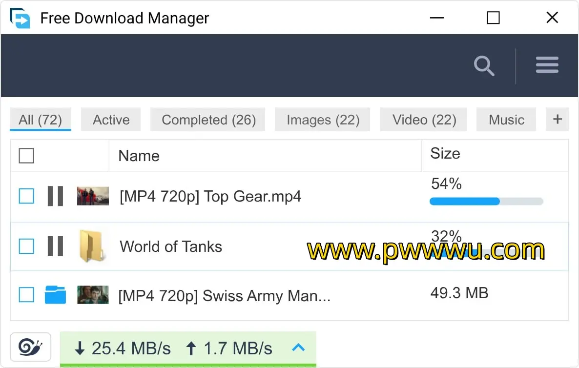 Free Download Manager 是一款功能强大的下载管理器,它支持 Windows、macOS、Android 和 Linux 系统。这款软件能够让您轻松调整流量使用,有序地组织下载任务,并管理 torrent 文件的优先级。它特别擅长高效下载大文件,并能够修复损坏的下载文件。
