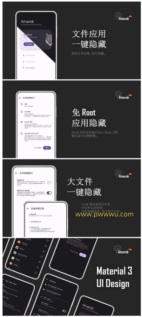 Amarok是一款专注于隐私保护的轻量级工具,它能够通过一键操作隐藏您的私密文件和应用程序。该工具以其简洁和高效而著称,以下是其主要功能和特点: