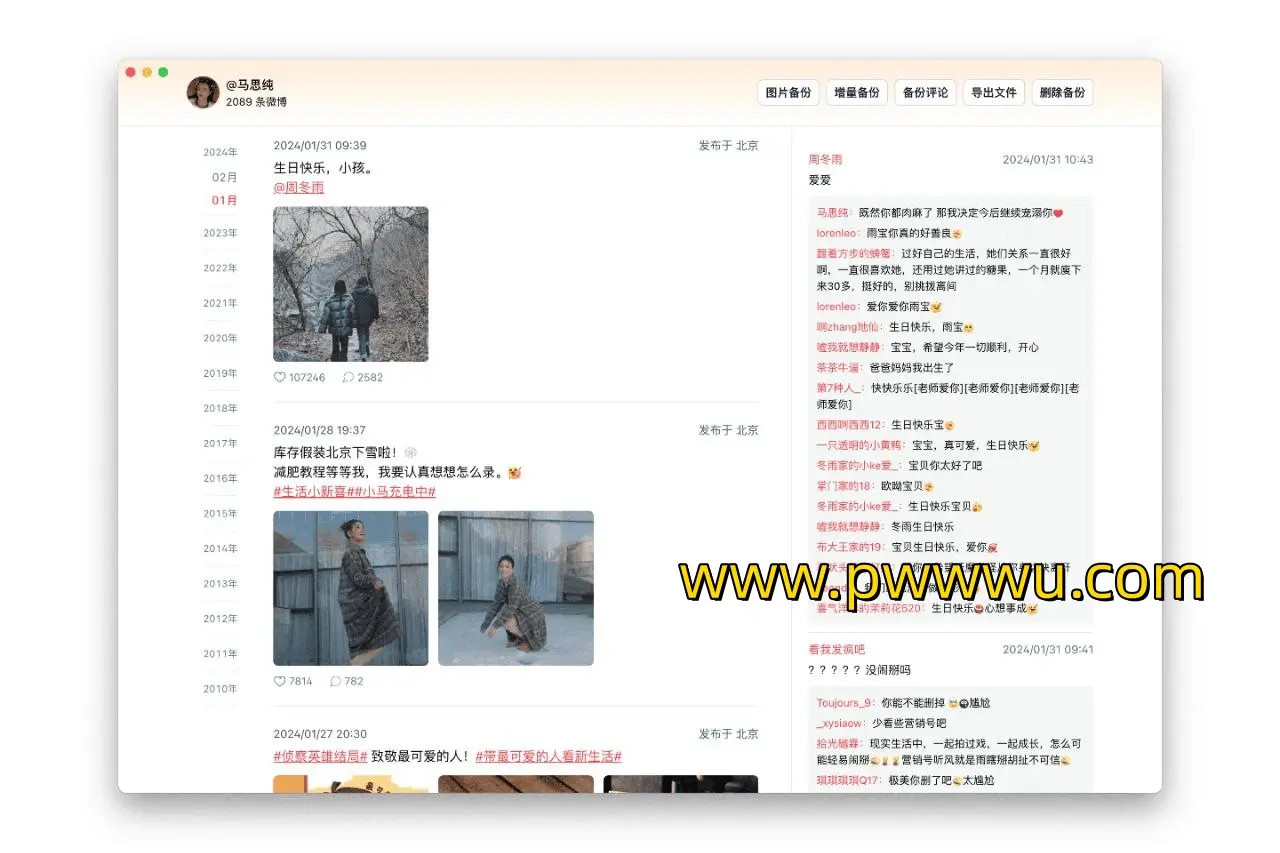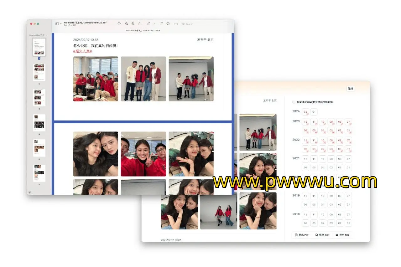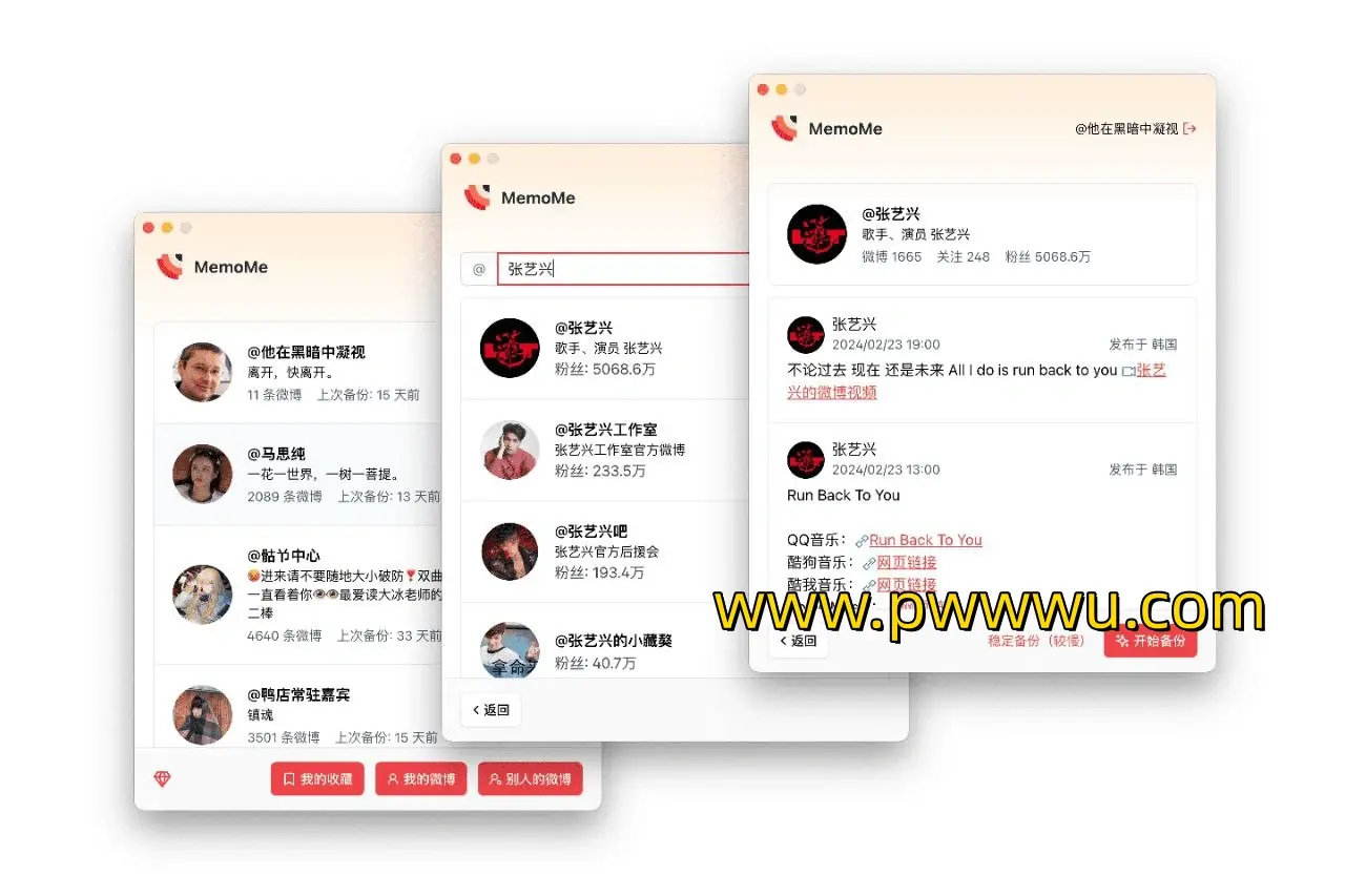 MemoMe是一款功能强大的新浪微博备份工具,旨在帮助用户轻松地将微博账户中的文字、图片、评论和收藏等内容导出并保存为PDF文档,确保数据的长期安全。使用MemoMe,用户可以完整地备份从注册微博账号至今的所有内容,包括个人发布的微博以及公开的他人微博,实现了随心所欲的备份体验。