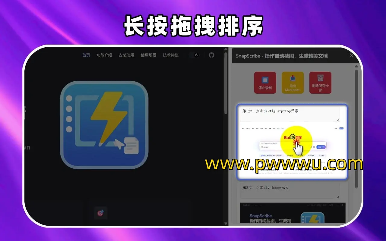 SnapScribe,一款高效的浏览器扩展工具,专为简化网页操作文档的创建而设计。它能够实时追踪用户在网页上的点击行为,并自动捕捉高质量的屏幕截图,进而快速生成包含步骤标题的Markdown格式教程或手册。这一过程完全自动化,省去了传统方法中手动截图、粘贴和排版的繁琐步骤。SnapScribe在每次用户点击时,都会自动截取屏幕画面,并智能识别点击元素的文本,用作步骤的标题。用户可以在侧边栏中预览和编辑这些步骤,通过拖拽轻松调整顺序,并最终一键导出Markdown文件和相关图片,即刻获得一份结构化、图文并茂的专业文档。