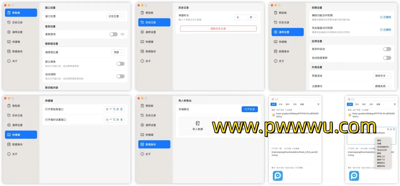 为了满足不同用户的个性化需求,EcoPaste 提供了丰富的设置选项,允许用户根据自己的喜好定制工具,打造独一无二的使用体验。同时,完善的文档和社区支持确保了用户和开发者之间可以进行有效的交流和协作,共同推动 EcoPaste 的发展。
