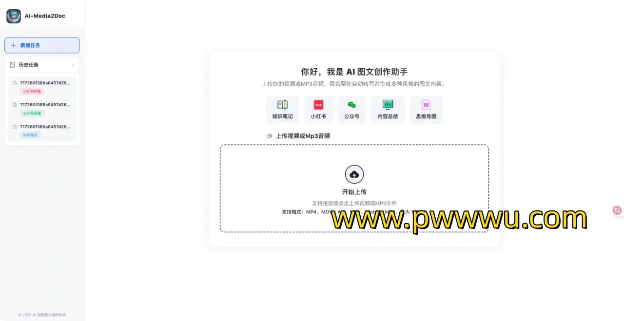 AI-Media2Doc 在保护用户隐私方面表现出色,无需进行注册或登录,所有任务记录均存储于用户设备上。应用程序的前端采用 ffmpeg wasm 技术,用户无需安装 ffmpeg 即可直接使用。支持多种文档风格,包括小红书、微信公众号、知识笔记、思维导图和内容总结等。