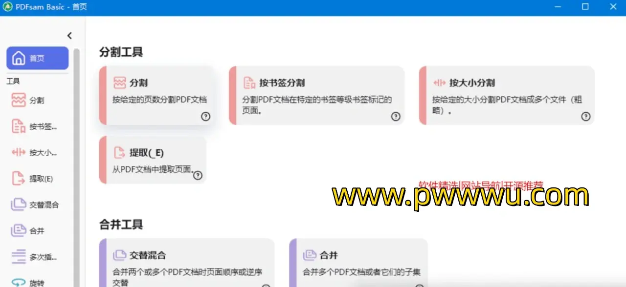 PDFsam Basic 是一款功能强大的PDF处理工具,适用于macOS、Windows和Linux系统。它提供了多种功能,包括旋转、分割、提取和合并PDF文件。以下是该软件的主要功能: