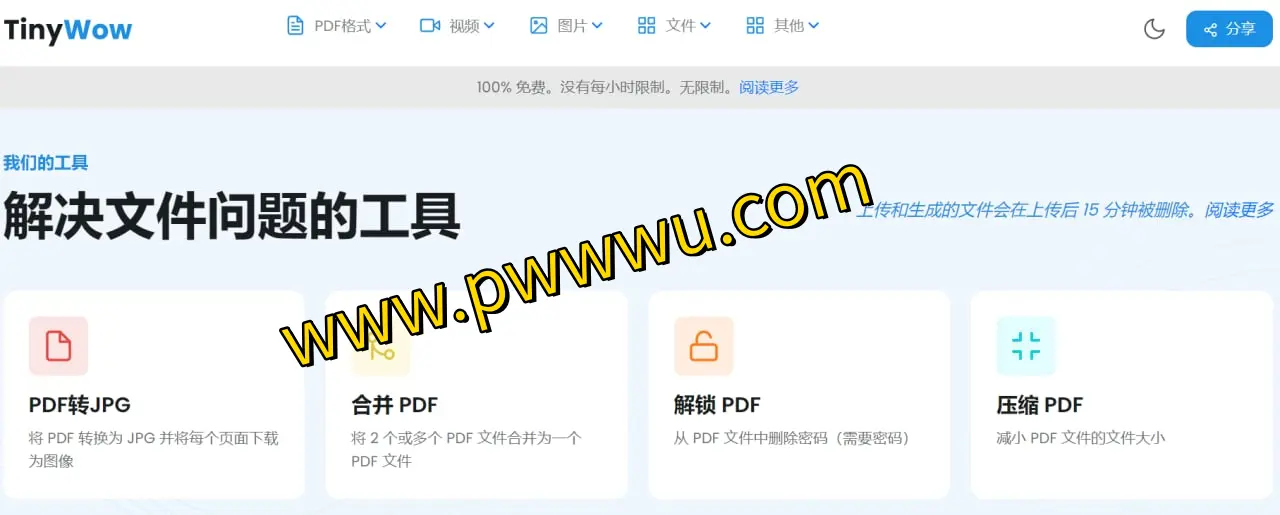 TinyWow是一个功能丰富的在线工具平台,专注于为用户提供多样化的文件处理服务。该网站涵盖了PDF文档、视频剪辑以及图像编辑等多种实用工具,所有功能均可免费使用,无需付费或注册。