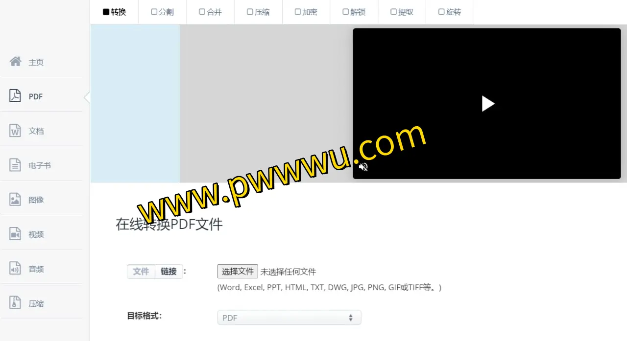 该在线平台初始界面为英文版本,用户可通过点击页面右上角选项切换至简体中文界面。Aconvert支持对PDF、文档、电子书、图像、视频及音频等多种文件类型进行多样化处理与格式转换,其兼容的输出格式相当丰富。