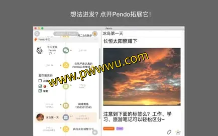 作为一款跨平台记事工具,Pendo笔记能够将各类记录内容按照时间顺序清晰地呈现在一条时间轴上,方便用户追溯和管理。
