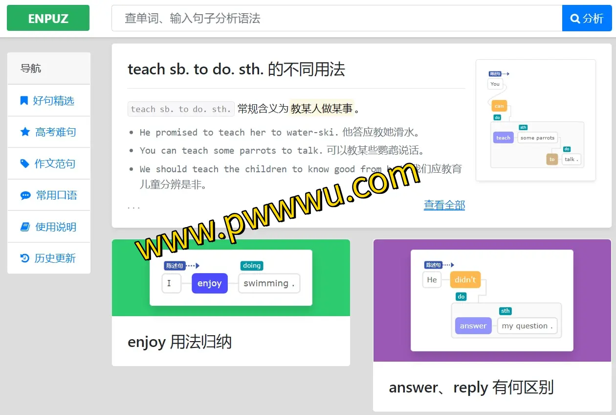 这是一个由学习社群推荐的英语学习平台。站点内汇集了优质例句、高考复杂句型、写作模板以及日常会话用语等多个类别。离开校园多年,许多英语知识已经生疏,开口表达时常犯语法错误。这个站点提供了语法查询功能,当你对某个语法结构的运用不够确定时,可以在这里进行检索。