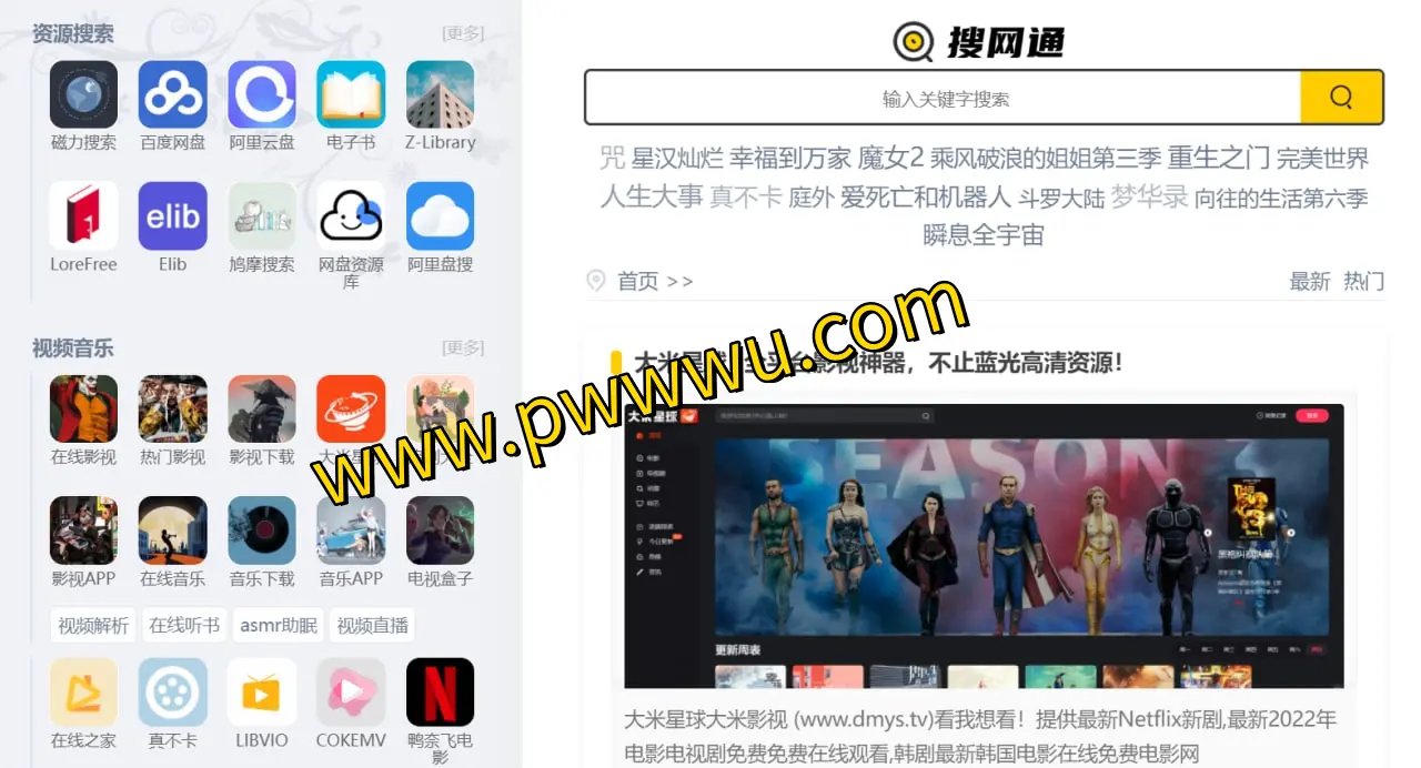 搜网通是一个综合性的网络资源搜索平台,能够帮助用户查找各类数字内容。无论是磁力链接、云端存储文件、电子书籍、影视节目还是音乐曲库,都可以在这里进行检索。这个工具覆盖范围广泛,当您需要寻找特定资料时,不妨来试试看。