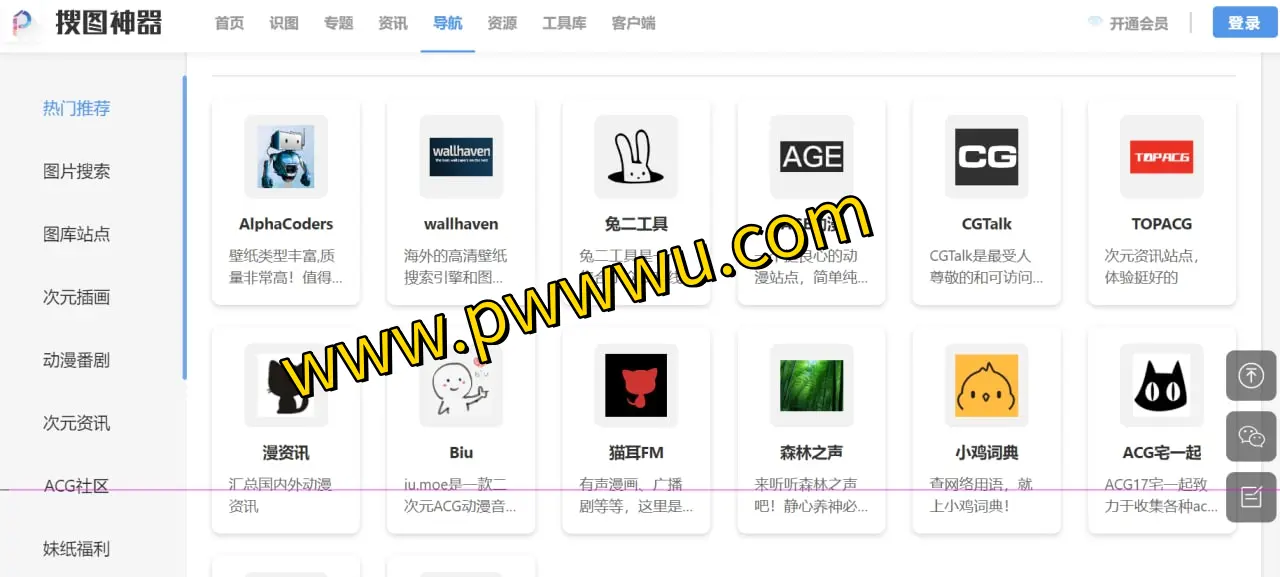 该平台专注于图像检索服务,提供电脑与手机壁纸的搜索及下载功能,同时支持通过上传图片进行反向搜索。其导航模块整合了大量二次元资源站点,涵盖图库资源、动漫插画、番剧索引、资讯动态、同好交流社区等分类内容。