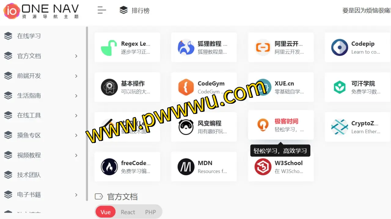 这是一个专门为编程人员设计的资源导航站点。它汇集了多种编程相关的官方文档站点、视频学习平台、电子书资源库以及线上实用工具等。