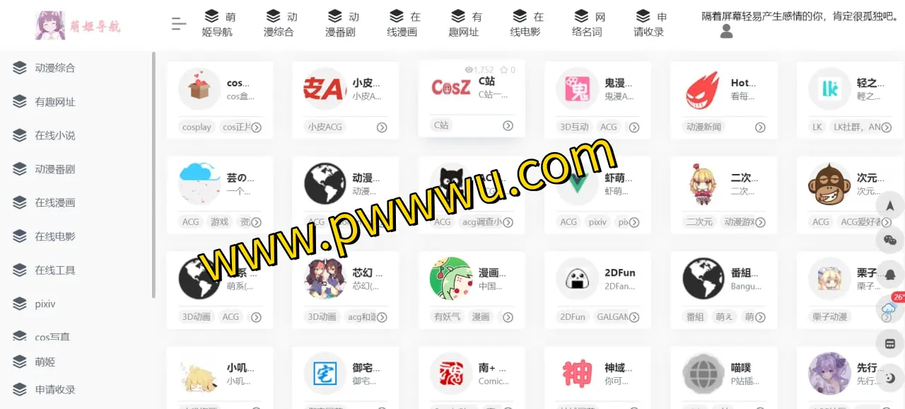 萌姬导航是一个专注于动漫领域的资源指引站点。该平台汇集了海量与二次元文化相关的内容,致力于为爱好者提供便捷的资源查找服务。