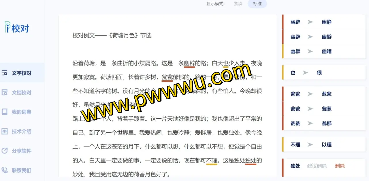 爱校对 爱校对是一个专注于文档校对服务的在线平台,能够帮助用户快速发现文本中的错别字,并提供替换或删除建议。 主要功能 自动识别错别字并给出修改提示 支持用户自定义正词词典,避免误报 可添加错词词典和敏感词词典,提升校对准确性 分享地址: https://www.ijiaodui.com/home