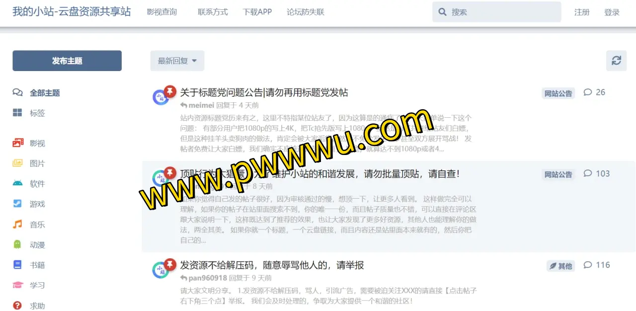 这是一个专注于阿里云盘资源共享的平台。开发者将站内资源细致划分为影视、游戏、软件等多个类别,方便用户查找。访问部分内容需要完成注册登录并在对应帖子内回复方可获取。