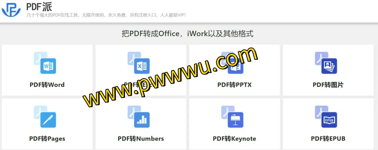 PDF派是一款专注于文档格式转换的在线工具,能够帮助用户轻松实现PDF与Word、Excel、PPT、图片、Pages、Numbers、epub等多种文件类型之间的互相转换。