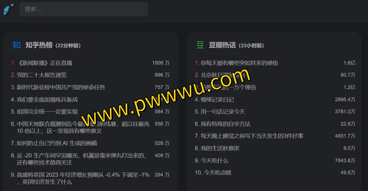 这是一个信息聚合平台,能够帮助用户迅速掌握各大社交媒体的热门动态。平台汇集了知乎、豆瓣、微博、今日头条、虎扑、天涯、哔哩哔哩、脉脉、IT之家、中关村在线、爱范儿、开源中国、CSDN、虎嗅、什么值得买等主流社区的最新内容。