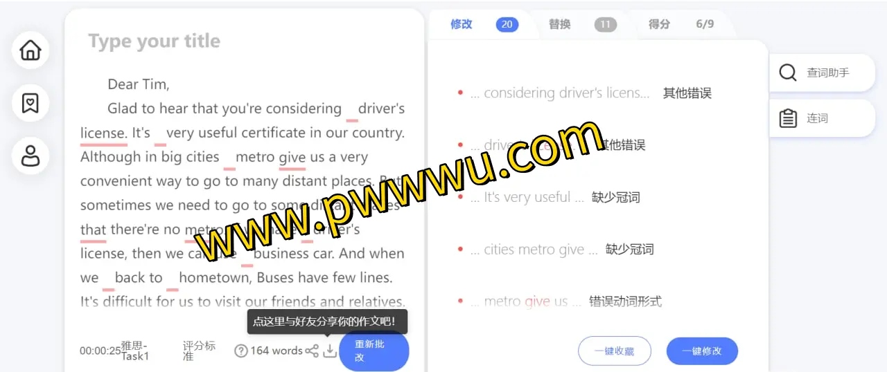 通过人工智能技术,平台可自动检测文章中的表达缺陷,并提供具体改进方案。其特色在于能够根据雅思、托福等国际考试标准进行针对性评估,帮助用户快速提升学术写作水平。内置的同义词库和逻辑词集合,让文章表达更具多样性与连贯性。