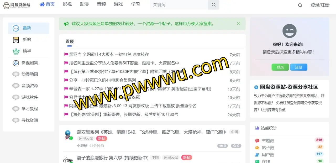 这是一个专注于网盘资源共享的在线社区,汇集了多种主流云存储服务的资源内容。用户无需注册账户即可浏览并获取资源链接,若需参与内容发布或社区互动则需完成登录流程。