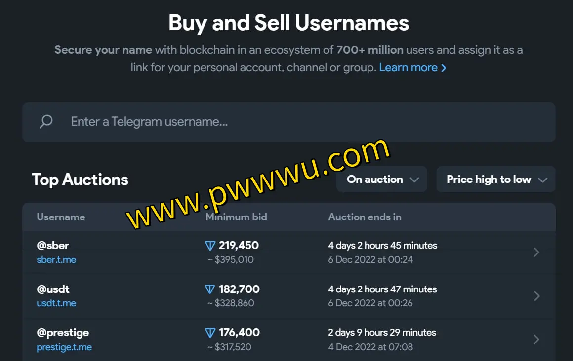FRAGMENT是一个专注于Telegram用户名交易的服务平台。该网站作为官方授权的用户名交易渠道,允许用户为个人账号、群组或频道购买简短的专属用户名。平台提供的部分用户名资源是从原有频道主或群主手中回收所得,但通过该渠道购得的用户名将获得稳定的所有权保障。