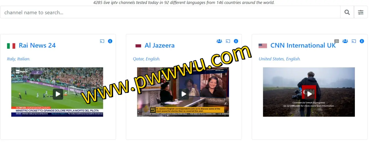 该平台专注于整合全球范围内的电视直播资源,收录了覆盖150个国家地区、94种语言类型的4633个直播频道。所有资源均采用通用格式,支持在线直接观看或通过专业播放工具加载。用户可依据国家区域、语言分类和节目类型进行精准筛选,部分频道还提供多语言字幕功能。