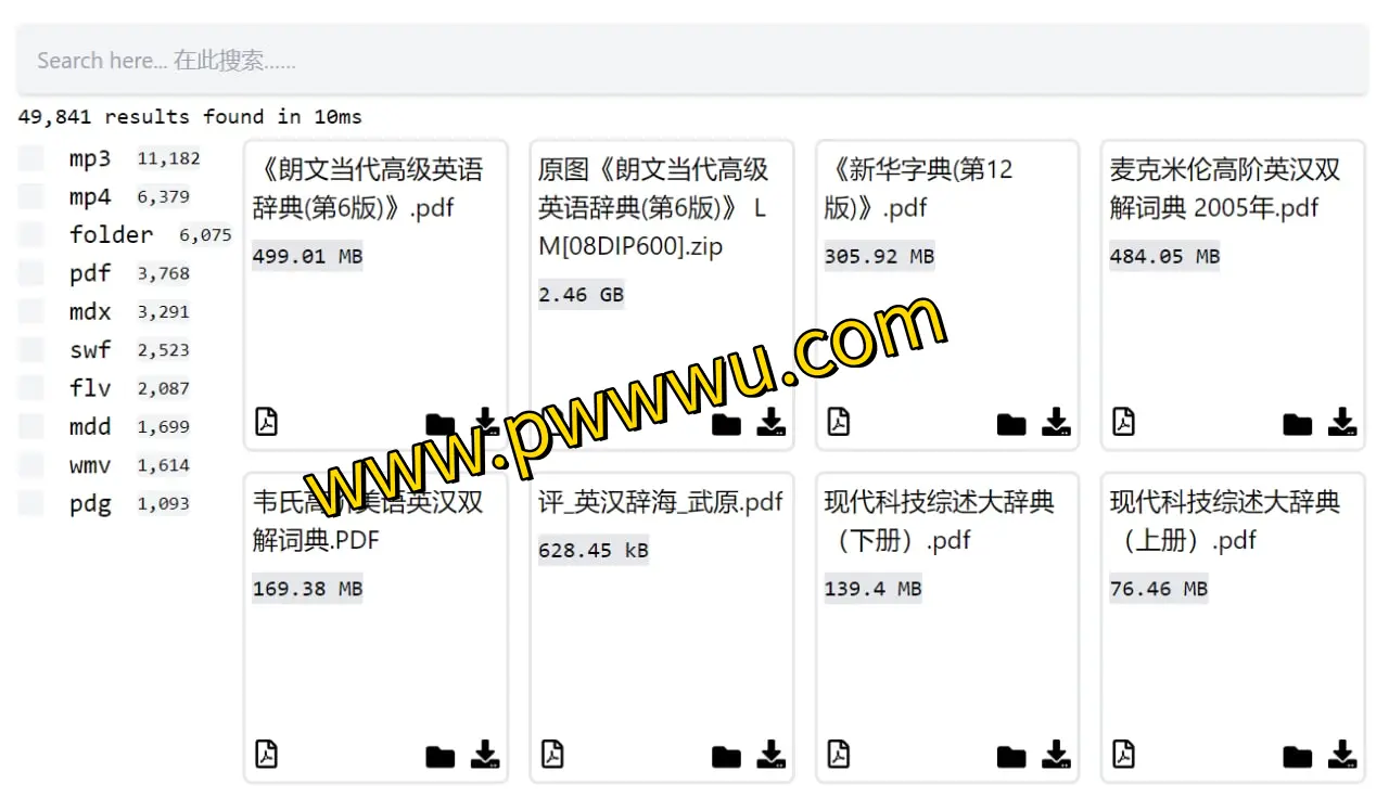 该平台汇集了海量词典资源,涵盖英语词典、新华词典、英汉辞海及汉语词典等多个类别。资源格式丰富多样,包括PDF文档、MP3音频及FLV视频等,用户可自由下载至本地进行离线使用。