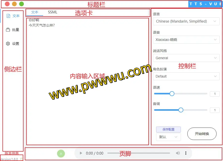 这款软件名为TTS-Vue,是一款开源且免费的文字转语音应用程序。它能够将文本内容转换为语音文件,方便用户进行语音播放或保存。