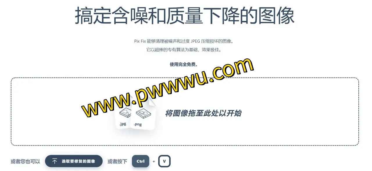 欢迎使用Pix Fix,这是一款专注于图像修复的在线工具。该服务能够有效处理因噪点和过度JPEG压缩导致的画质损伤问题,帮助用户恢复图片的原始细节。
