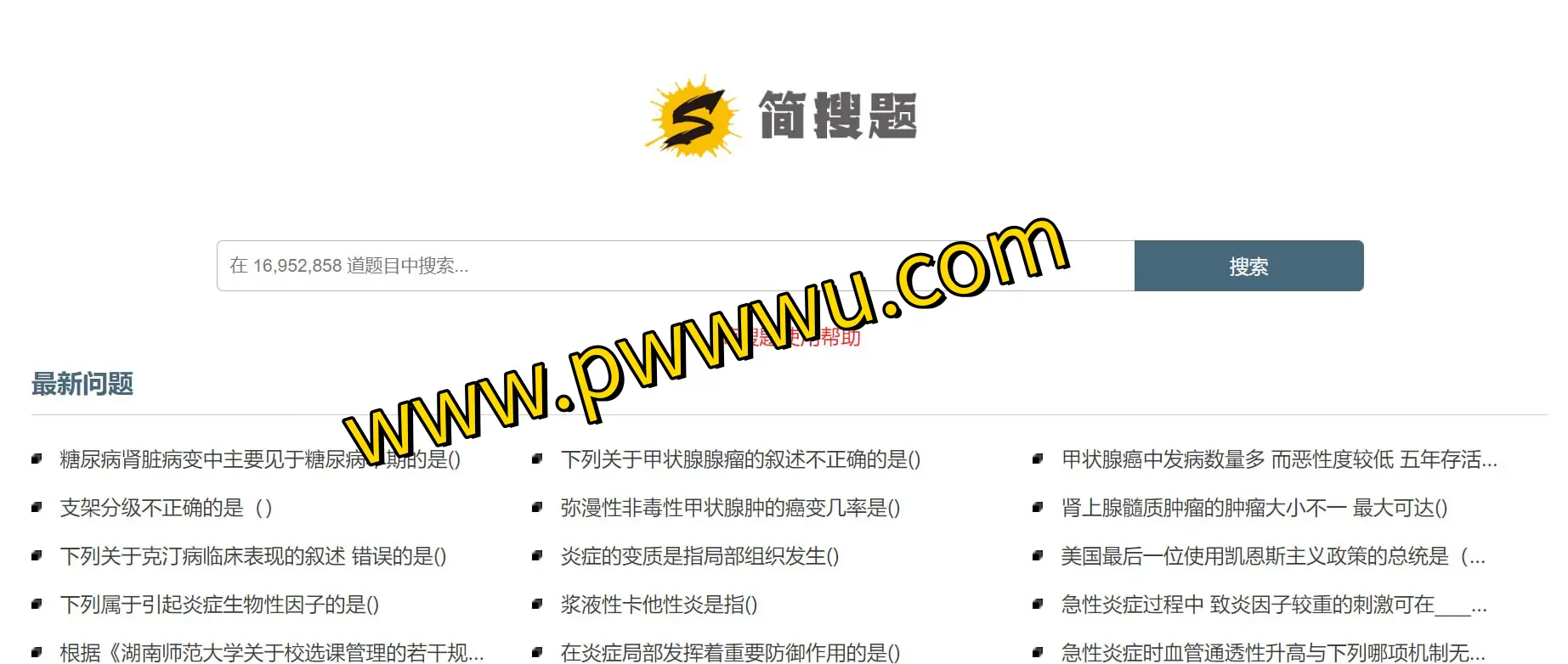 简搜题是一个专注于习题搜索与答案查询的专业平台。目前平台已整合数百万各类考试题目资源,涵盖公务员考试、建筑工程、职业资格认证、会计从业、医药卫生、外语外贸、学历晋升等多个领域,并提供详细的题目解析与参考答案。
