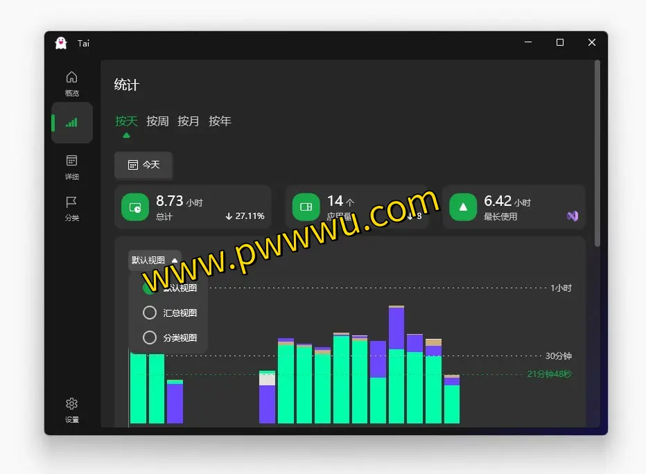 Tai是一款专为Windows系统设计的开源应用程序,它能够帮助用户追踪和记录各个软件的使用时长。这款工具类似于iPhone系统中的屏幕使用时长统计功能,让您清晰了解自己在不同程序上花费的时间。