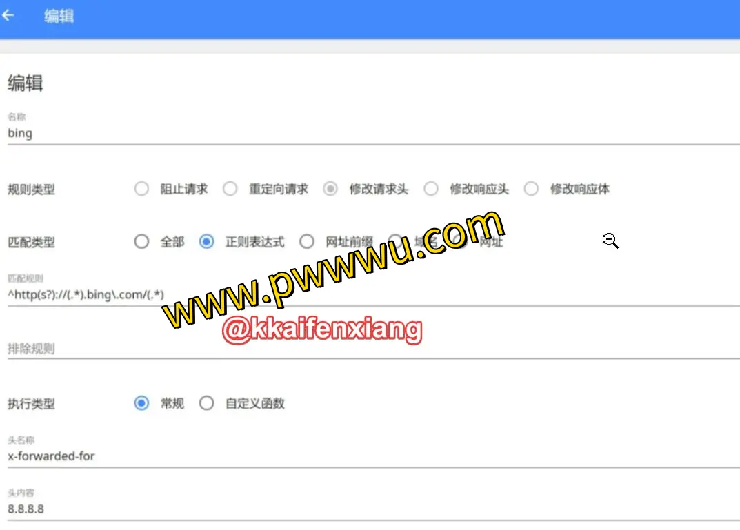 以访问New Bing为例,可通过以下配置实现:在匹配规则栏填入特定格式的正则表达式,在头名称栏目输入x-forwarded-for,在头内容栏填入指定IP地址即可完成设置。