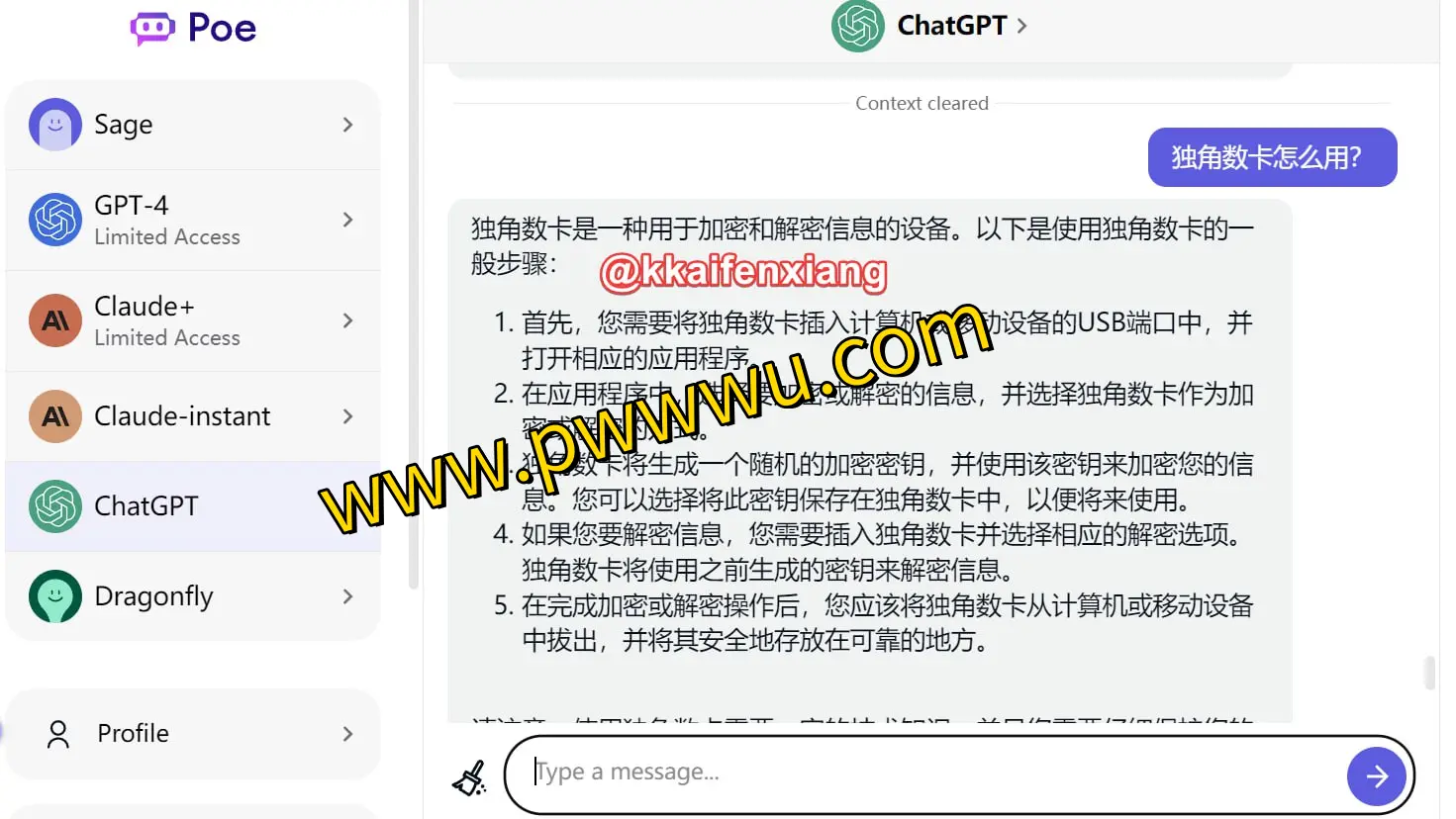 Poe是一款集合多种主流智能模型的对话程序。它整合了Sage、GPT-4、Claude+、Claude-instant、ChatGPT以及Dragonfly等众多先进模型。值得一提的是,除GPT-4外,其余模型均可免费使用。