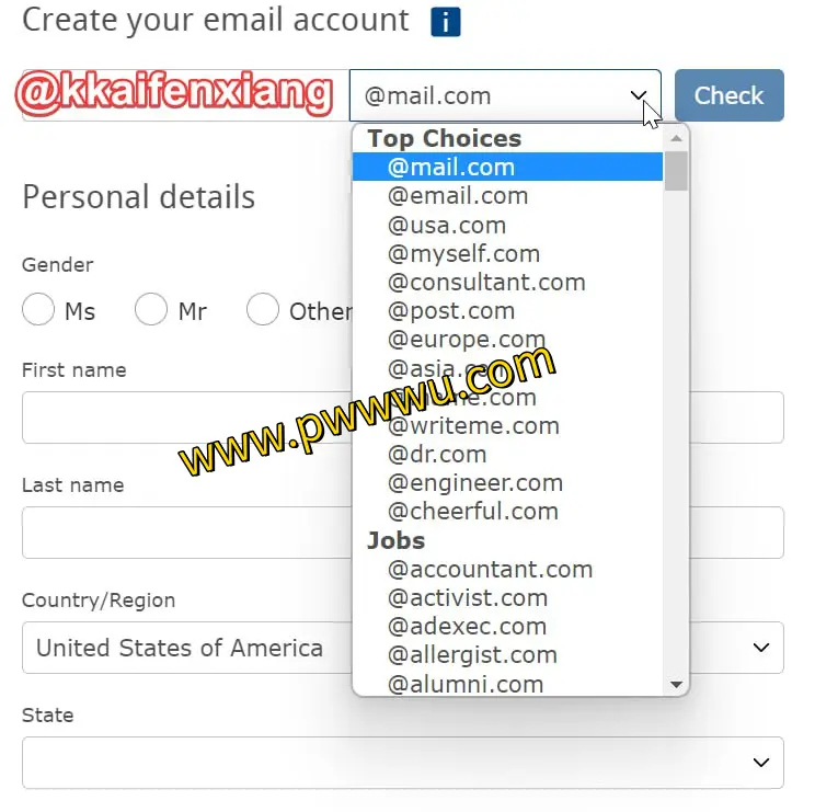 - 超过100种电子邮件域名可选,包括@mail.com、@gmx.com、@email.com等