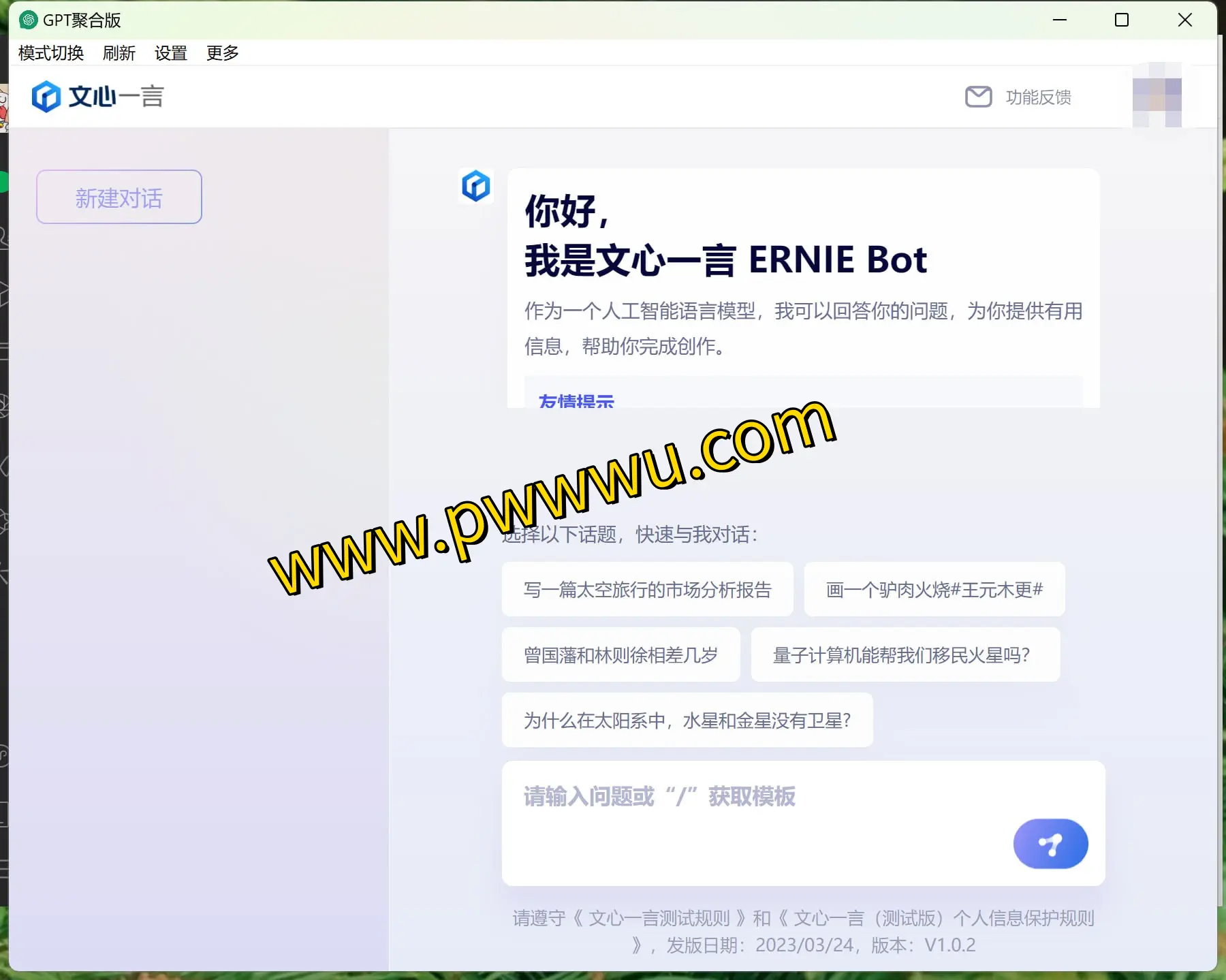 该程序整合了ChatGPT官方版本、免费版本、文心一言、Poe以及ChatChat等多个平台资源,同时允许用户根据需求自行添加其他对话平台。需要注意的是,部分功能需要用户登录相应账号并具备平台使用权限方可正常体验。