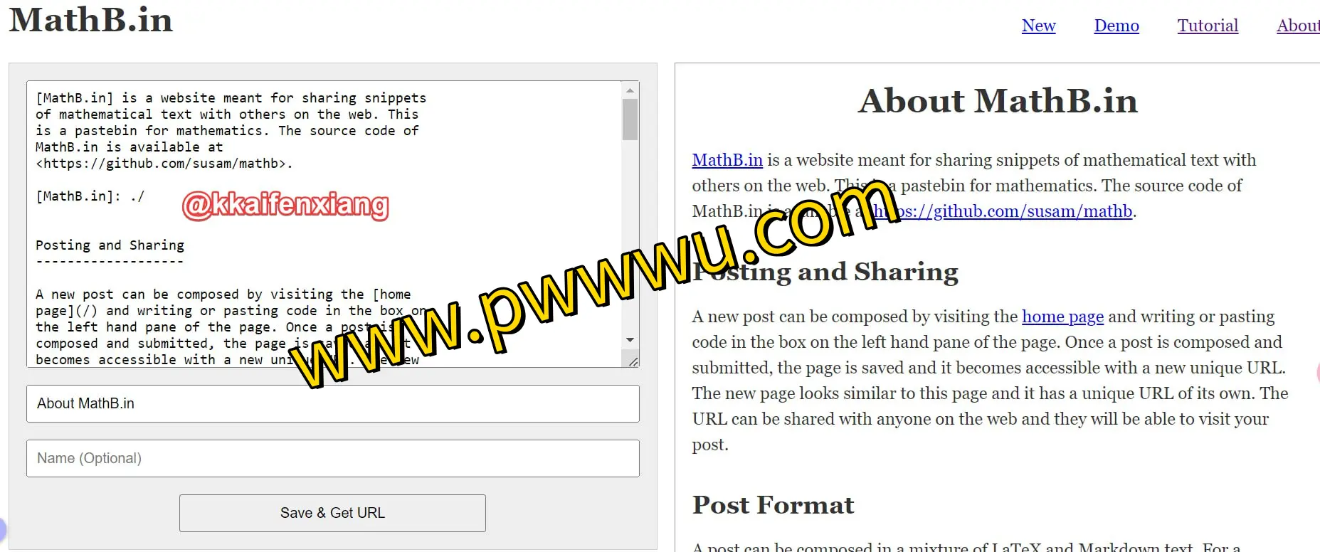 MathB.in 是一个专注于数学内容分享的在线平台。用户可以在网站左侧编辑区域输入或粘贴数学公式与文本片段,完成编辑并提交后,系统将生成一个具有独立访问地址的页面。该页面布局与编辑界面保持一致,且每个页面都拥有专属链接,便于用户将数学笔记、演算过程或解题思路分享给他人进行查阅与讨论。