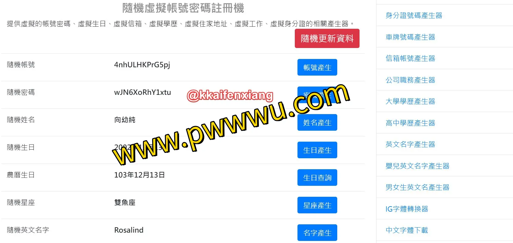 在这个平台上,用户可以随机生成各类虚拟信息: