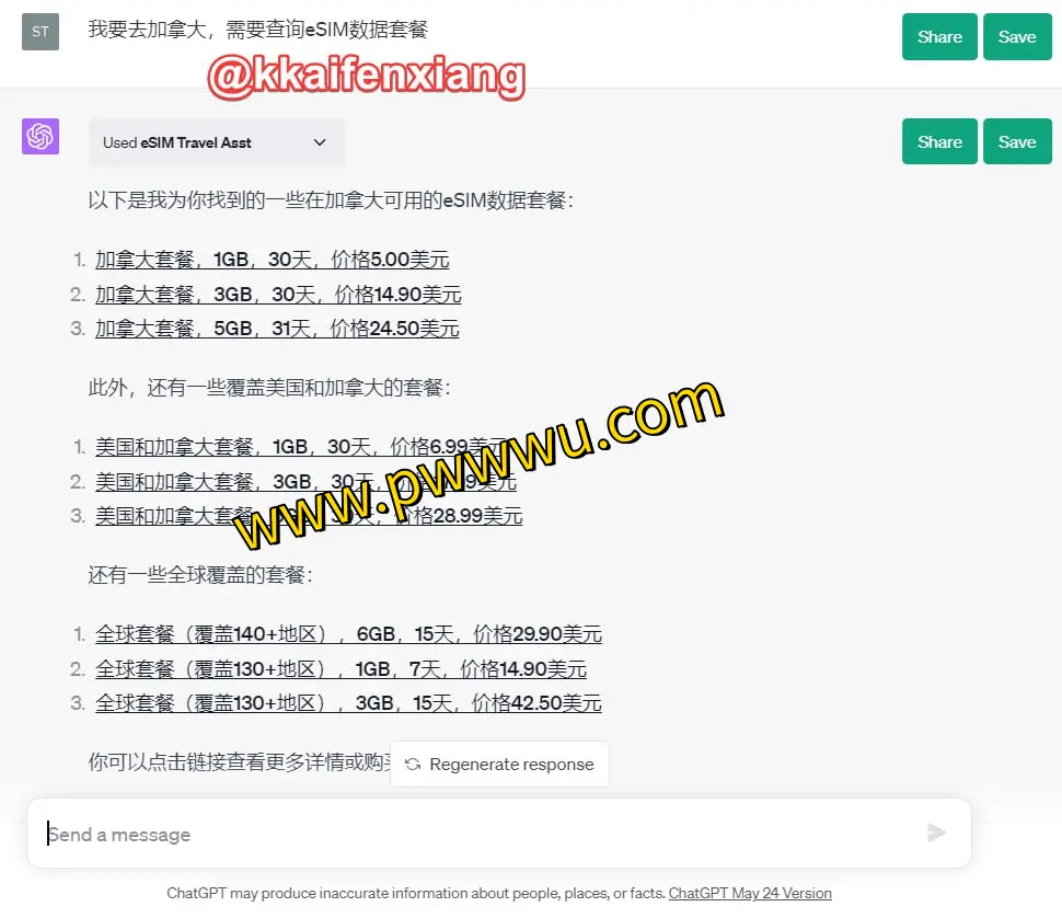 通过ChatGPT插件商店安装后,直接发送目的地国家或地区名称即可获取对应的eSIM数据套餐信息。该服务覆盖全球多个国家和地区,可帮助用户提前规划通信方案。
