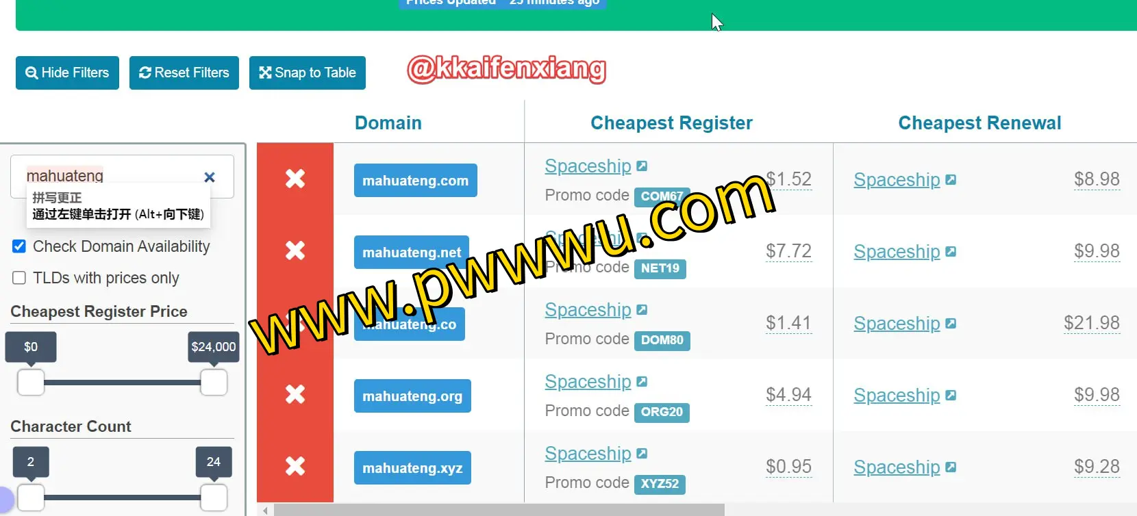 - 支持按注册费用、续费价格、转移成本进行筛选